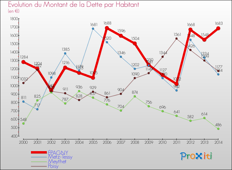 A Épagny, la dette par habitant a donc augmenté de 31.07 % entre 2000 et 2014.