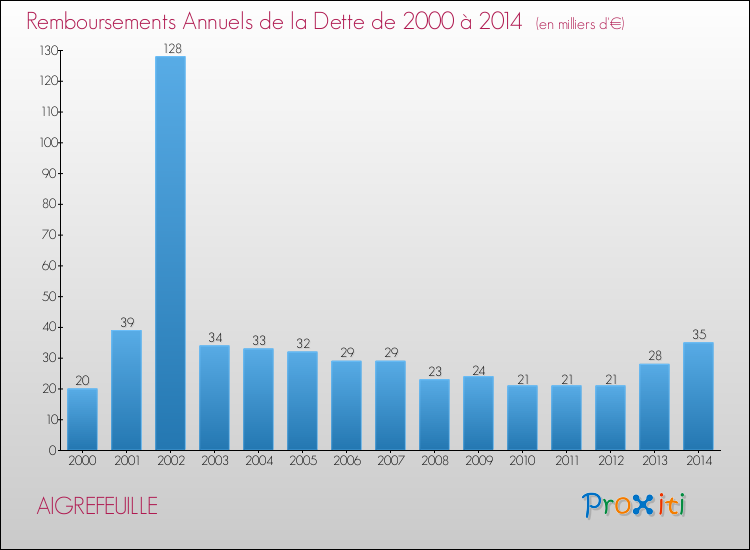 Par rapport aux 1135 habitants de Aigrefeuille, en 2014 le poids de cette dette représente 318 € par habitant.