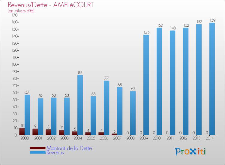 Comparaison Revenus/Dette de Amelécourt (de 2000 à 2014)