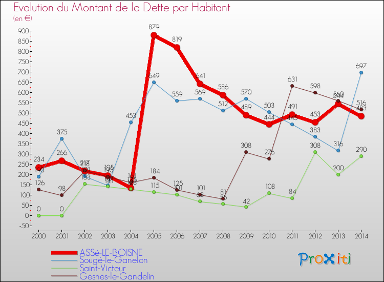 Le graphique ci-dessous représente l'évolution de la dette par habitant à Assé-le-Boisne depuis 2000.