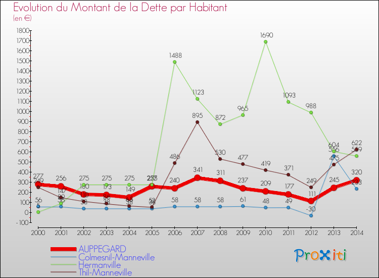 A Auppegard, ce montant de la dette est en augmentation de 31.46 % par rapport à 2013.