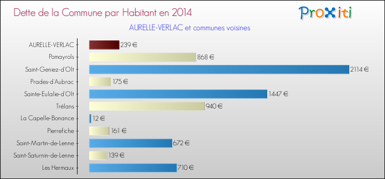 A Aurelle-Verlac, la dette due par habitant de la commune en 2014 est donc moins élevée de 54.39 % que pour des communes similaires.