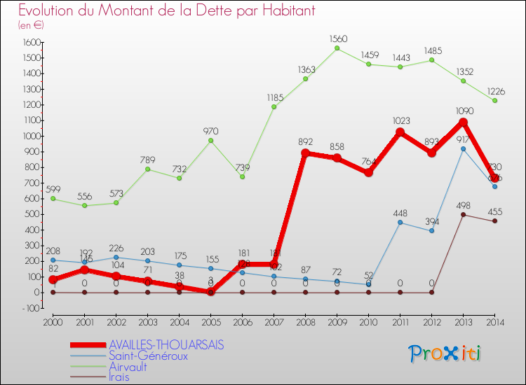 Pendant la même période, les communes françaises similaires à Availles-Thouarsais, ont vu leur dette par habitant augmenter de 10.58 % en moyenne entre 2008 et 2013.
