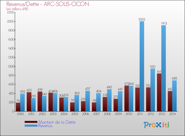Comparaison Revenus/Dette de Arc-sous-Cicon (de 2000 à 2014)