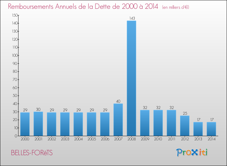 Par rapport aux 253 habitants de Belles-Forêts, en 2014 le poids de cette dette représente 429 € par habitant.