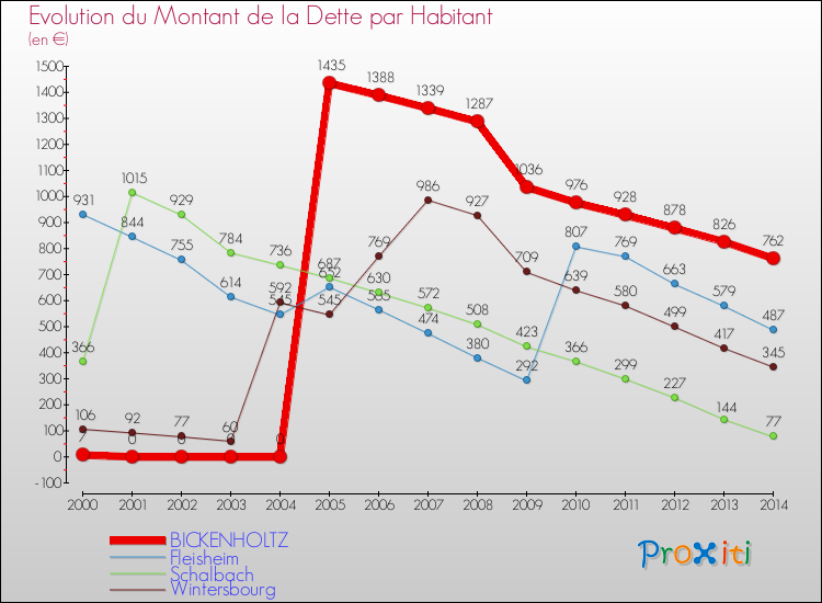 A Bickenholtz, la dette par habitant a donc augmenté de 10785.71 % entre 2000 et 2014.