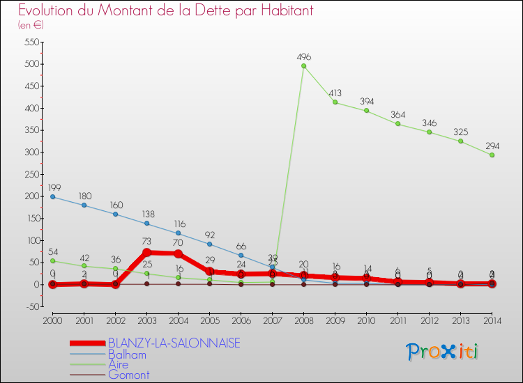 Pendant la même période, les communes françaises similaires à Blanzy-la-Salonnaise, ont vu leur dette par habitant augmenter de 5.05 % en moyenne entre 2008 et 2013.