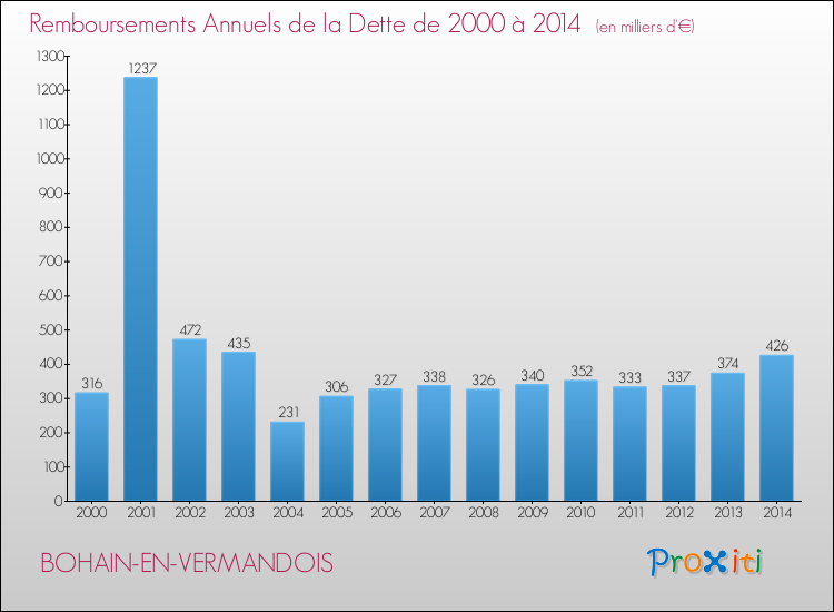Pendant la même période, les communes françaises similaires à Bohain-en-Vermandois, ont vu leur dette par habitant baisser de 3.23 % en moyenne entre 2000 et 2014.