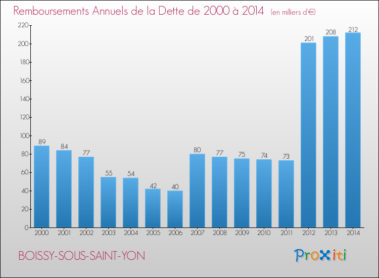 Par rapport aux 3761 habitants de Boissy-sous-Saint-Yon, en 2014 le poids de cette dette représente 383 € par habitant.