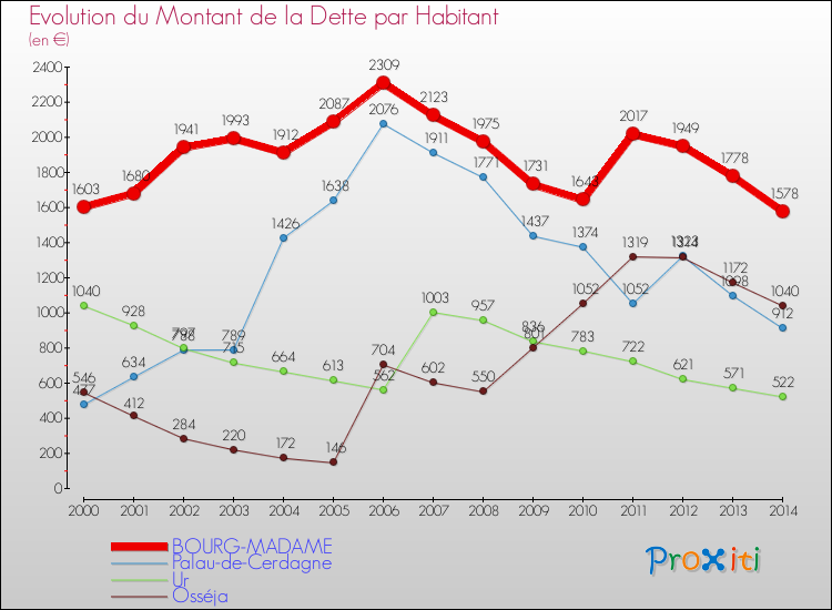 Par rapport aux 1407 habitants de Bourg-Madame, en 2014 le poids de cette dette représente 1578 € par habitant.