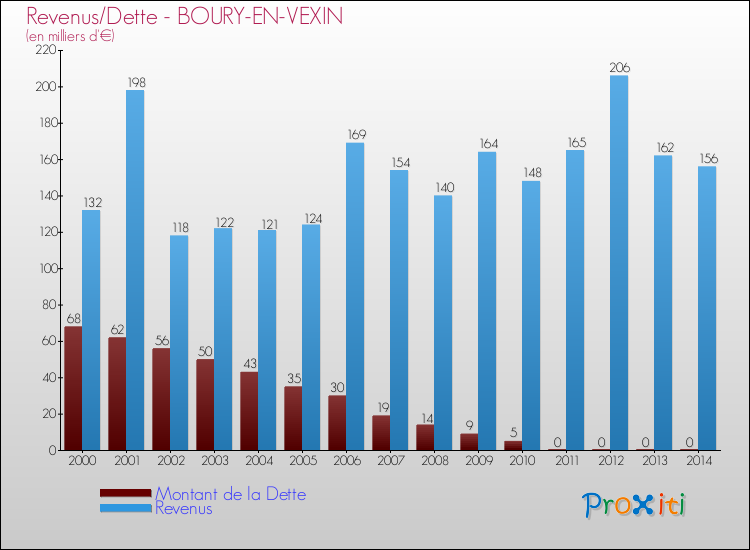 Comparaison Revenus/Dette de Boury-en-Vexin (de 2000 à 2014)