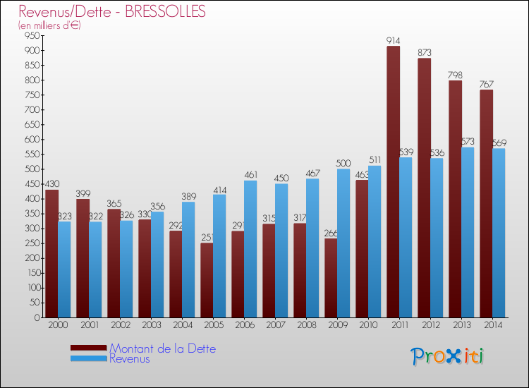 Par rapport aux 770 habitants de Bressolles, en 2014 le poids de cette dette représente 996 € par habitant.