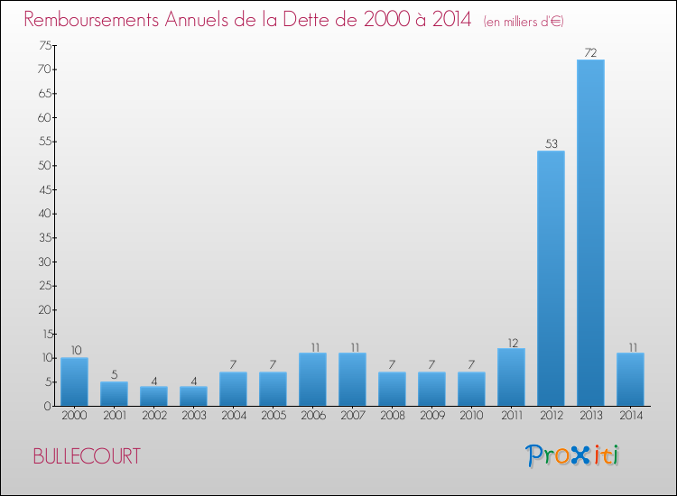 Par rapport aux 254 habitants de Bullecourt, en 2014 le poids de cette dette représente 295 € par habitant.