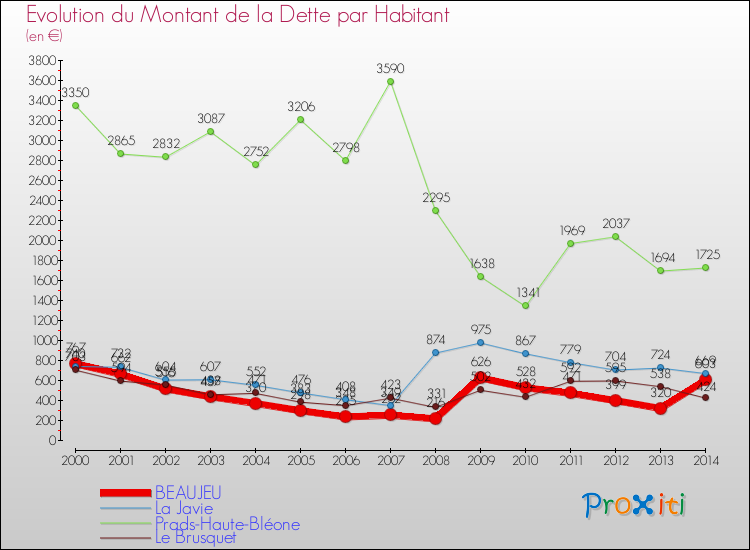 Par rapport aux 149 habitants de Beaujeu, en 2014 le poids de cette dette représente 603 € par habitant.