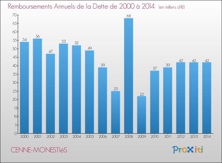A Cenne-Monestiés, la dette par habitant a donc augmenté de 74.85 % entre 2000 et 2014.