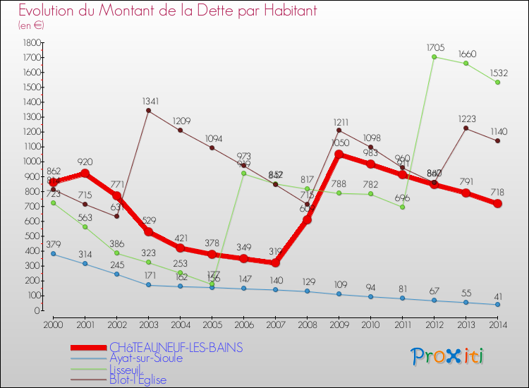 Comparaison de la dette par habitant pour CHâTEAUNEUF-LES-BAINS et les communes voisines de 2000 à 2014