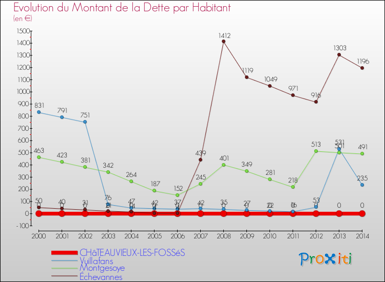 Le graphique ci-dessous représente l'évolution de la dette par habitant à Châteauvieux-les-Fossés depuis 2000.