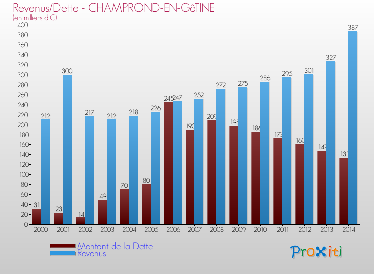 Comparaison Revenus/Dette de Champrond-en-Gâtine (de 2000 à 2014)