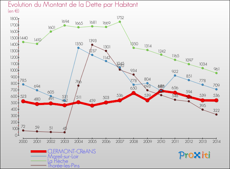 Par rapport aux 1287 habitants de Clermont-Créans, en 2014 le poids de cette dette représente 536 € par habitant.