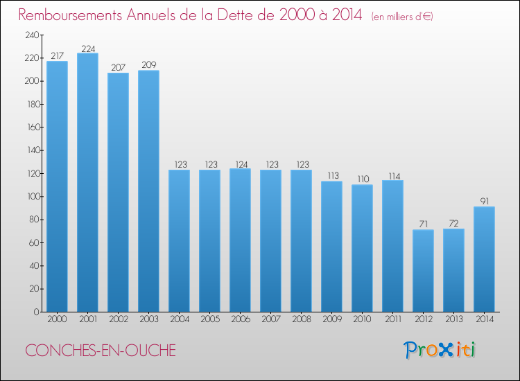 A Conches-en-Ouche, la dette par habitant a donc baissé de 30.11 % entre 2000 et 2014.