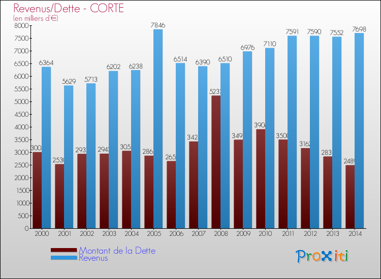 Comparaison Revenus/Dette de Corte (de 2000 à 2014)