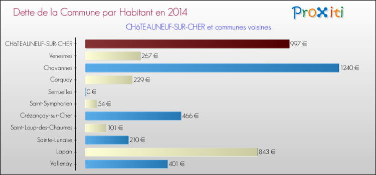 A noter : la valeur moyenne de la dette par habitant des communes françaises similaires à Châteauneuf-sur-Cher était de 703 € par habitant, en 2014.