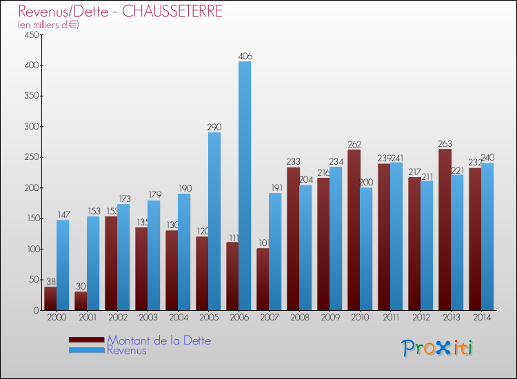 Comparaison Revenus/Dette de Chausseterre (de 2000 à 2014)