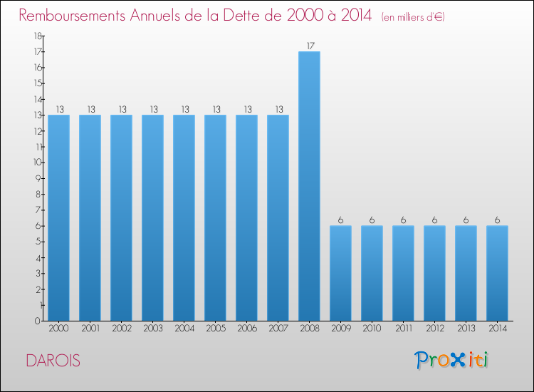 A Darois, la dette par habitant a baissé de 50.89 % entre 2008 et 2013.