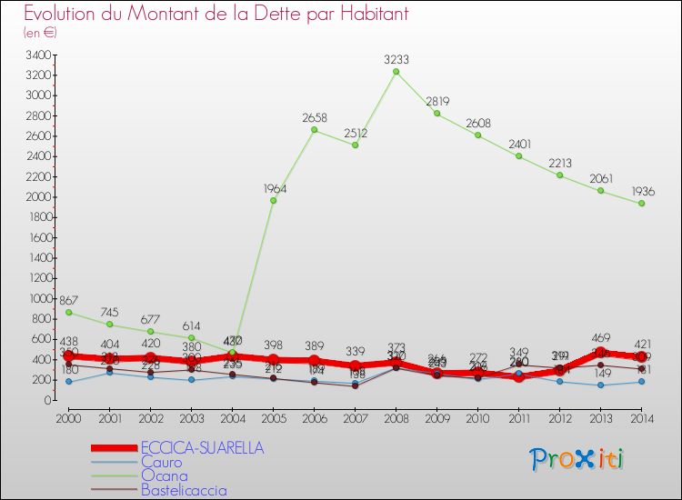 A Eccica-Suarella, la dette par habitant a donc baissé de 3.88 % entre 2000 et 2014.