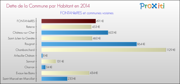 A Fontanières, la dette due par habitant de la commune en 2014 est donc plus élevée de 1.24 % que pour des communes similaires.