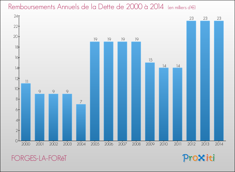Pendant la même période, les communes françaises similaires à Forges-la-Forêt, ont vu leur dette par habitant augmenter de 31.44 % en moyenne entre 2000 et 2014.