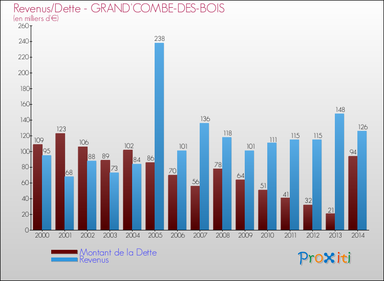 Comparaison Revenus/Dette de Grand'Combe-des-Bois (de 2000 à 2014)