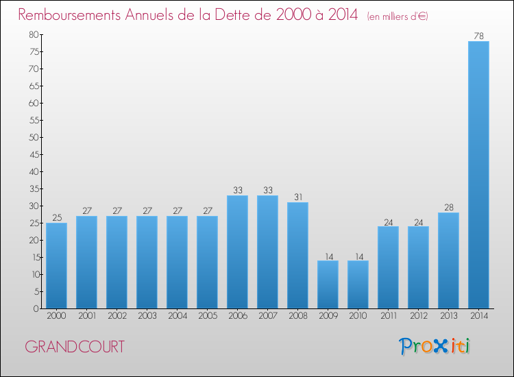 A Grandcourt, la dette par habitant a donc augmenté de 74.2 % entre 2000 et 2014.