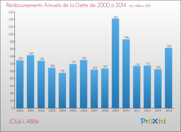 A Joué-l'Abbé, la dette due par habitant de la commune en 2014 est donc plus élevée de 164.43 % que pour des communes similaires.