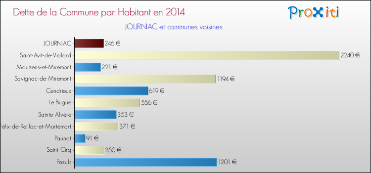 A noter : la valeur moyenne de la dette par habitant des communes françaises similaires à Journiac était de 552 € par habitant, en 2014.