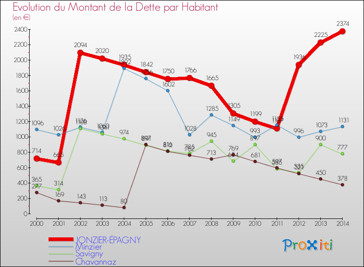 Par rapport aux 737 habitants de Jonzier-Épagny, en 2014 le poids de cette dette représente 2374 € par habitant.