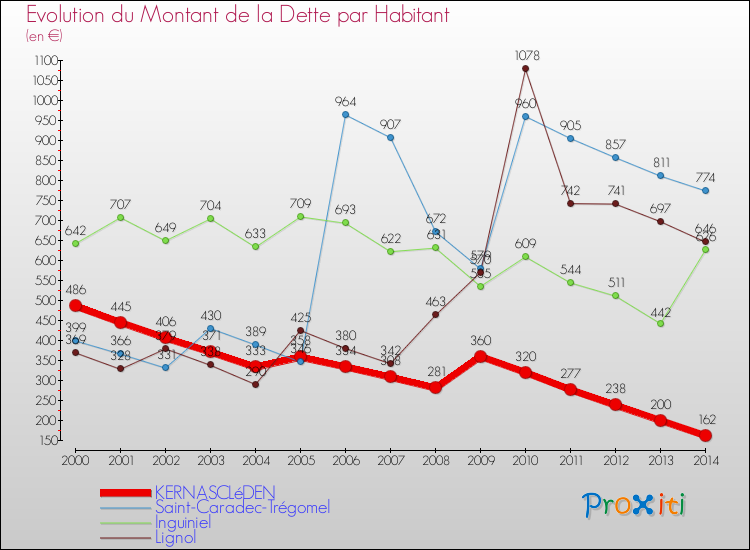 A Kernascléden, la dette par habitant a donc baissé de 66.67 % entre 2000 et 2014.