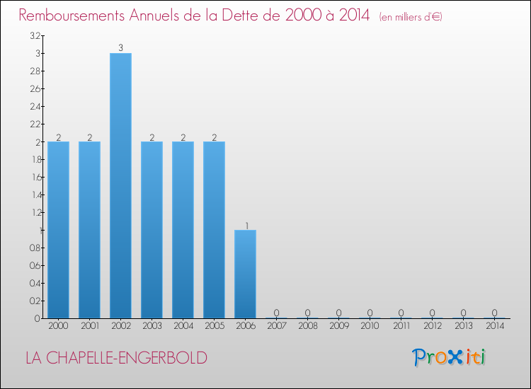 A La Chapelle-Engerbold, la dette par habitant a donc baissé de 90.91 % entre 2000 et 2014.
