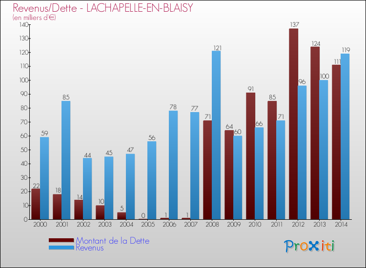 Comparaison Revenus/Dette de Lachapelle-en-Blaisy (de 2000 à 2014)
