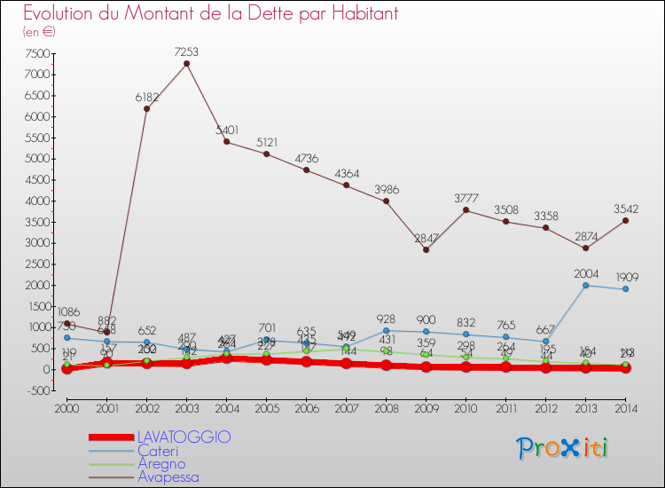 A Lavatoggio, la dette par habitant a donc augmenté de 38.1 % entre 2000 et 2014.