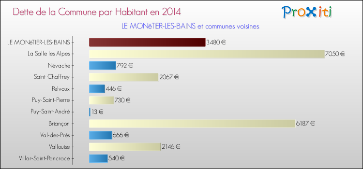 A Le Monêtier-les-Bains, la dette due par habitant de la commune en 2014 est donc plus élevée de 483.89 % que pour des communes similaires.