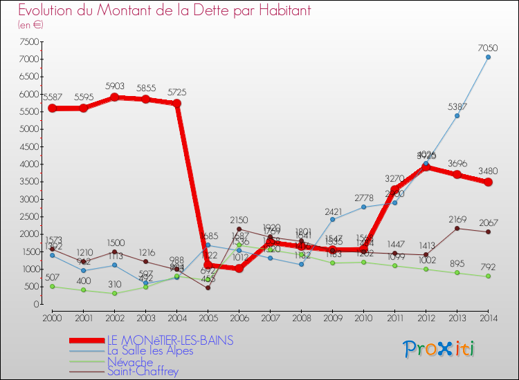 A Le Monêtier-les-Bains, la dette par habitant a donc baissé de 37.71 % entre 2000 et 2014.