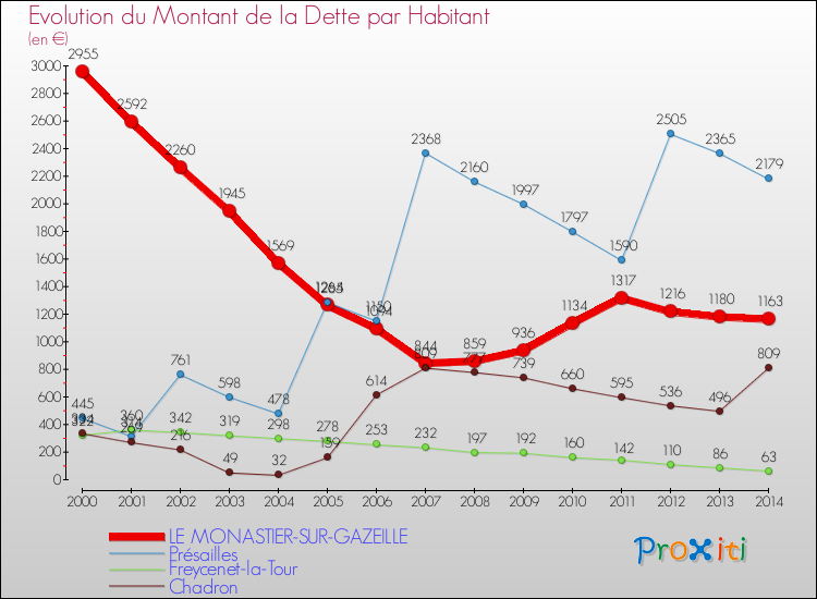 Comparaison de la dette par habitant pour LE MONASTIER-SUR-GAZEILLE et les communes voisines de 2000 à 2014