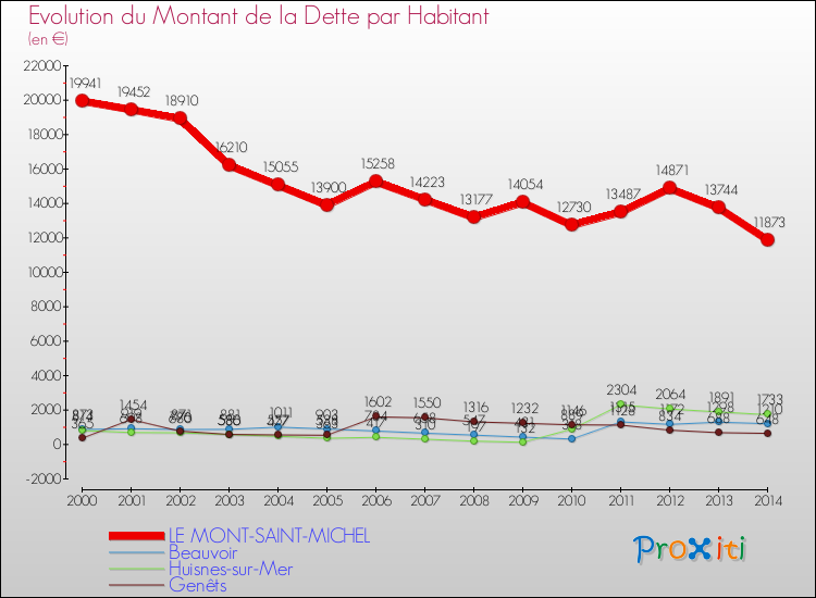 A Le Mont-Saint-Michel, la dette par habitant a donc baissé de 40.46 % entre 2000 et 2014.