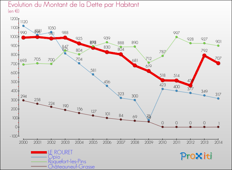 Pendant la même période, les communes françaises similaires à Le Rouret, ont vu leur dette par habitant augmenter de 7.59 % en moyenne entre 2000 et 2014.