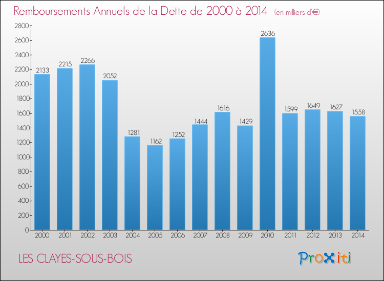 Par rapport aux 17939 habitants de Les Clayes-sous-Bois, en 2014 le poids de cette dette représente 871 € par habitant.