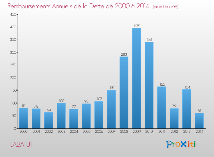 Par rapport aux 1491 habitants de Labatut, en 2014 le poids de cette dette représente 219 € par habitant.