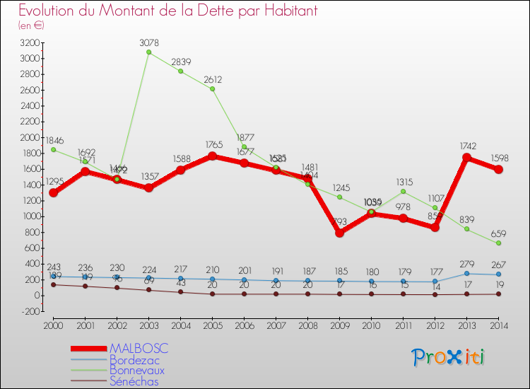A Malbosc, la dette par habitant a donc augmenté de 23.4 % entre 2000 et 2014.