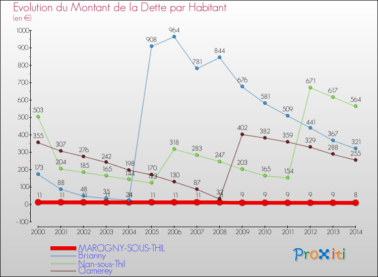 A Marcigny-sous-Thil, la dette par habitant a donc baissé de 27.27 % entre 2000 et 2014.