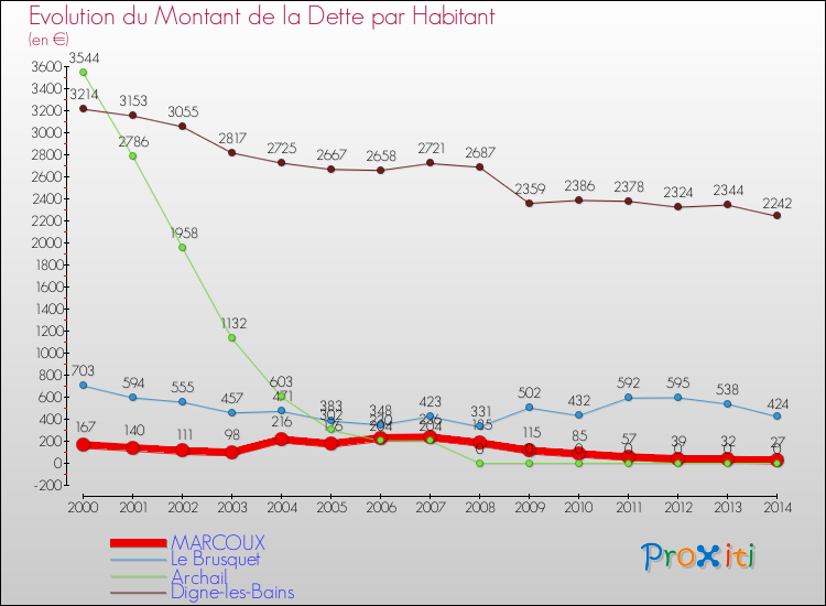 Par rapport aux 528 habitants de Marcoux, en 2014 le poids de cette dette représente 27 € par habitant.